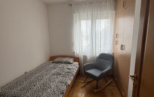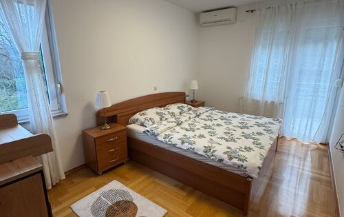 The apartment consists of lounge with kitchen and exit to the terraces with a beautiful view of the city, a master bedroom with exit to terrace, 2 single bedrooms, bathroom with bathtub and bathroom with shower, storage and loggia. Apartment is fully equipped. It has a garage for 2 cars and parking space in front of the building. This property is located 10 minutes from the city center in Nemetova street.