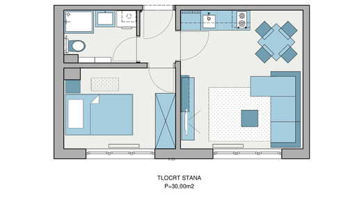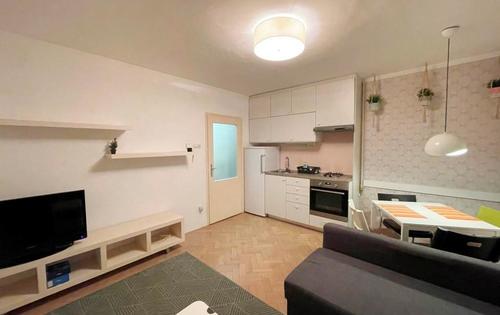 Nice, newly renovated apartment of approx. 30 sq situated on the high ground floor of a residential building. It consists of a hallway, open plan living room with kitchen and dining, bedroom and bathroom with shower. The apartment is located in a quite neighborhood Cvjetno naselje, near Savska cesta and street Prisavlje. It is very well connected by tram with the city centre, Novi Zagreb and Jarun.