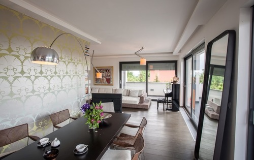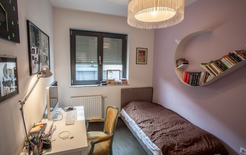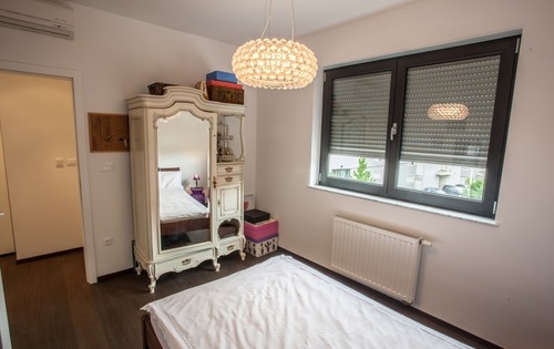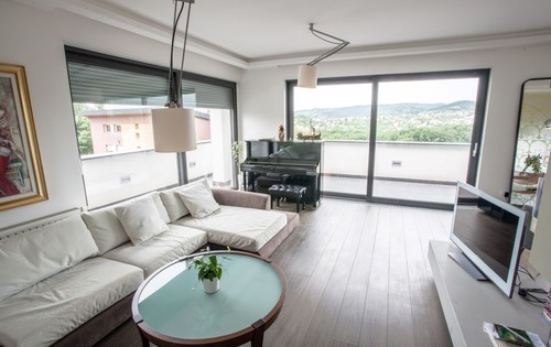 This luxurious penthouse of approx. 140 sq m, is placed on the 2nd floor and consists of: entrance hall, 3 bedrooms, 2 bathrooms, guest toilet, kitchen, living and dining area with exit to a nice terrace. It is fully furnished, with air conditioning and Internet. There is one garage parking place and one parking place in front of the building, as well as storage space in the basement of the building. It is only 7 min (4 km) by car from the central square, 12 min (8 km) to the International American School,15 min (10 km) to the German /French International School, 7 min (4 km) to the British International school (Dedici), 9min (5 km) International school Matija Gubec. Public transportation is available by bus.