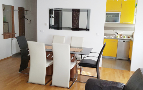 This property is placed on the first floor in a 3-storey building and has approx 90 sq m of living space. It has 2 double bedrooms, one single bedroom, open plan fully equipped kitchen with balcony, bathroom, and guest toilet. The property is equipped with central gas heating, washing machine, dishwasher, air-condition. Apartment has a garage and parking space in front of the building. Very good location near German and French international school.