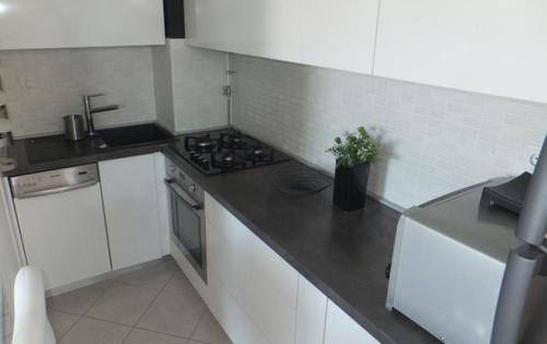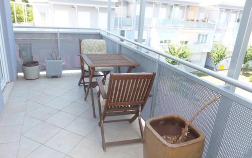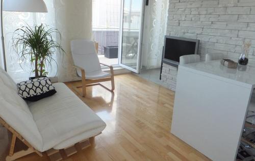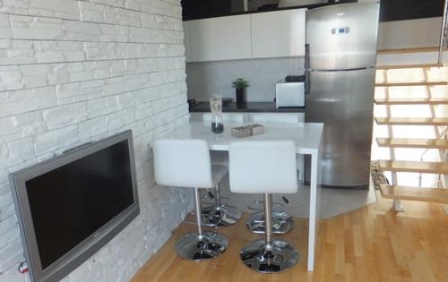 This property is placed on the 2nd, top floor of the building without elevator and has approx 48 sq m of living space plus 2 good size under-cover terraces. The apartment is very modern in 2 mezzanine spaces inside. Entry level holds an open plan kitchen with terrace and bathroom. Double bedroom with terrace is placed in mezzanine below. Up from the living room is placed mezzanine with study table and built-in wardrobe. Upper mezzanine is open space with living room and has enough space for sofa bed and can be used as 2nd bedroom. The property is very well equipped and has AC, Internet and central gas heating. One parking space is included in rental price.