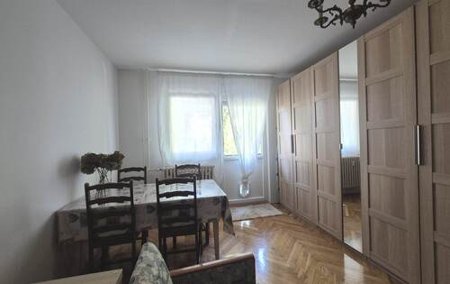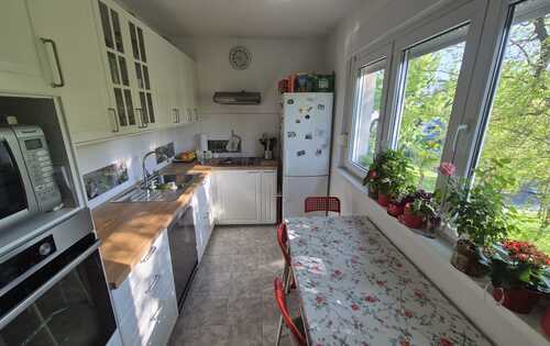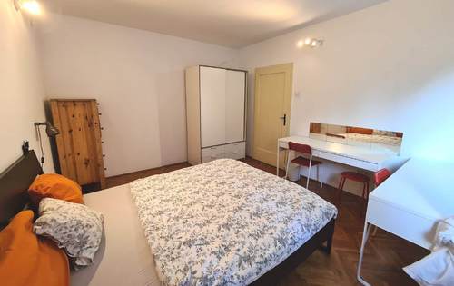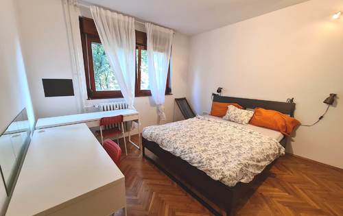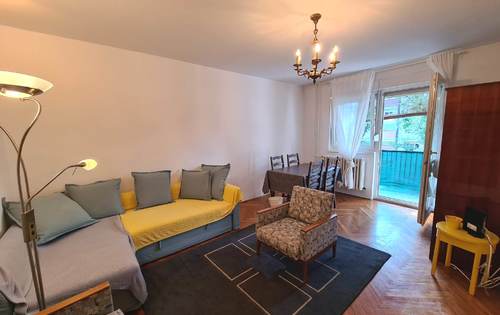 The apartment is situated on the 3rd floor in a building without an elevator. It consists of a hallway, living room with access to the balcony (orientation west) pull out corner sofa and tv, double bedroom, kitchen with all cutlery and crockery, toaster, kettle, oven and cooker, bathroom with shower, washing machine and dryer, separate toilet. Internet and AC are installed in the apartment. Public parking around the building is free.