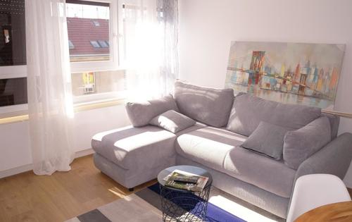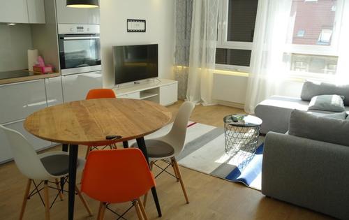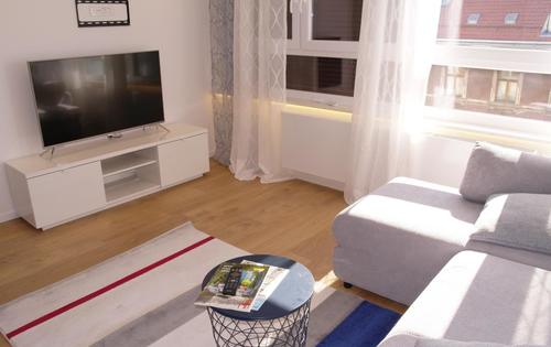 This modern two bedroom apartment of approx. 70 sq m of living area, is located a short walk from the Main Square. The apartment is placed on the 5th floor with elevator. This property comprises of an entrance hallway which leads on the right to an open plan kitchen/living area with guest toilet. On the left of the hallway there is one double bedroom with bathroom and one single bedroom with bathroom. The apartment is furnished to a high standard; with AC. The apartment also has an available garage parking space.