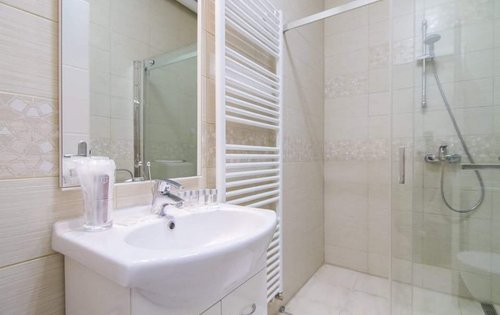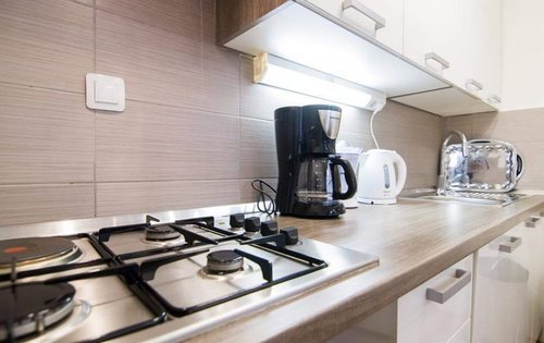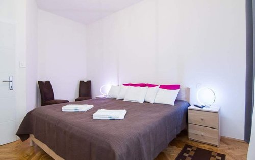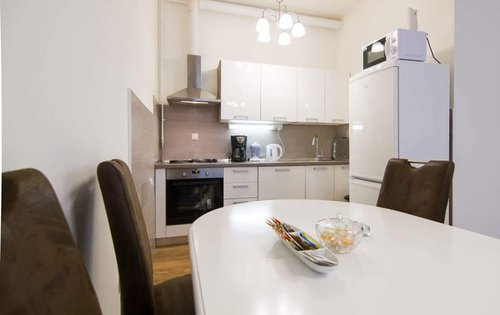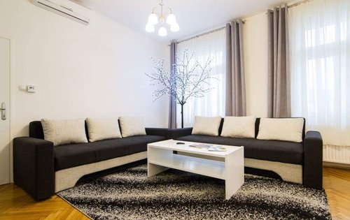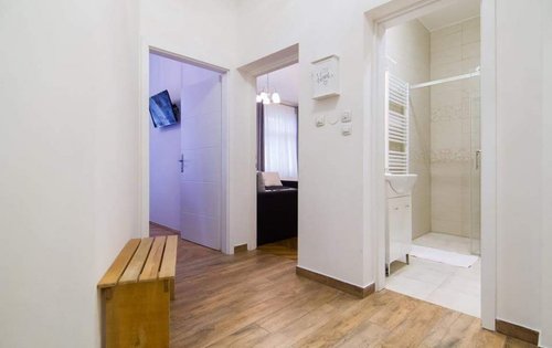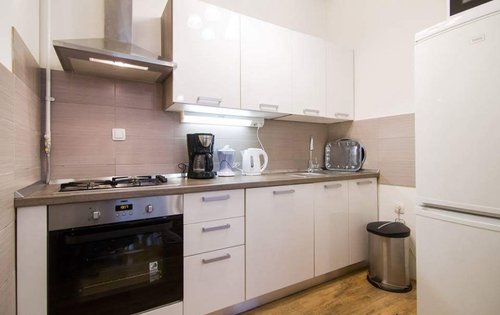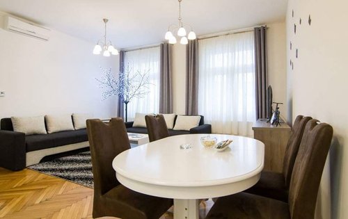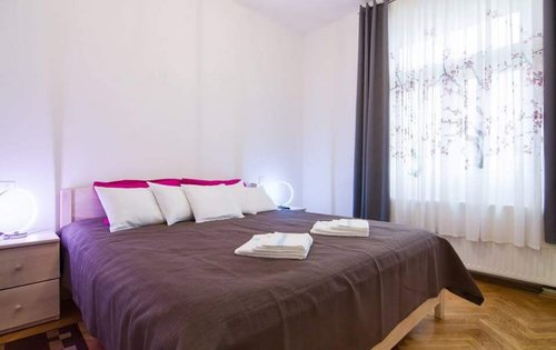 Renovated 1-bedroom apartment in city centre. This property is placed on the 4th floor with elevator, and has approx. 55 sq m of living space. It holds an entry hall, kitchen with dining, good size double bedroom with new furniture, living room, bathroom with shower. The location of the property is very good, very close to the main Square and public transport. It is equipped with AC, washing machine, dishwasher, and central gas heating.