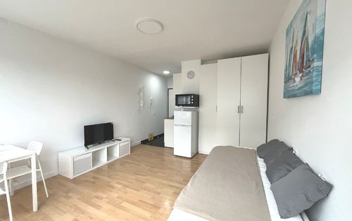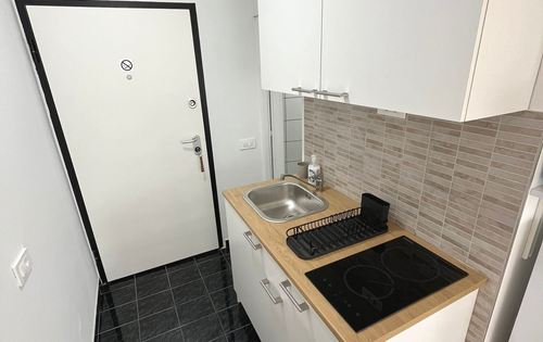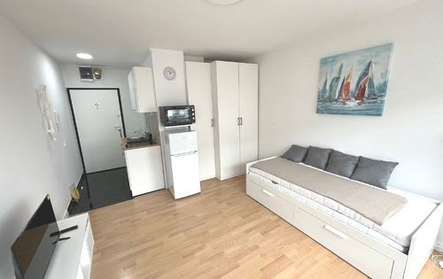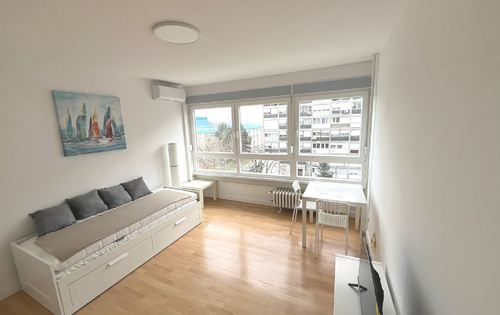 Completely newly furnished studio on the 4th floor in Utrine, it has new furniture, new household appliances, air conditioning, TV, intercom, installations, etc. Optics in the building, fast Internet. Utilities approx. 50-80 EUR per month. Building has 2 elevators. Quiet location, excellent connection by city transport; tram stop is near, bus stop in Travno is a 5-minute walk away. Close to Avenue Mall, Utrina market, Utrina pool, Bundek park, local shops and supermarket, all within a 5-10 minute walk in the neighborhood. Free public parking.
