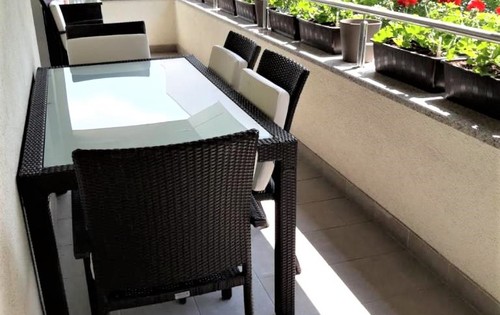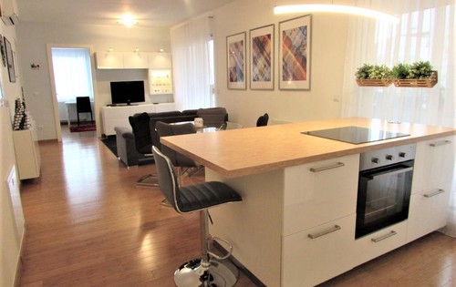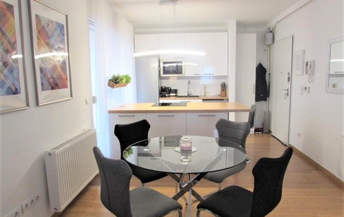 This nice apartment is placed on the 3rd floor, in a new building with elevator. It consists of two bedrooms, open plan kitchen with dining and living room, bathroom, terrace and secure parking space. This property has fully equipped kitchen (washing machine, microwave, coffee machine, oven, stove, toaster, fridge, etc.), 2 flat TV screens, A/C, desk, large shower, plenty of closet space. The apartment is located in a very quiet street, just a minute walk to the nearest tram station with a direct tram line to the main square and many other tourist attractions. Just a few steps from the apartment you can find a supermarket, bakery, kids playground, food market, different shops, ATM, cafes, etc.