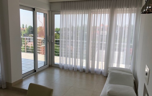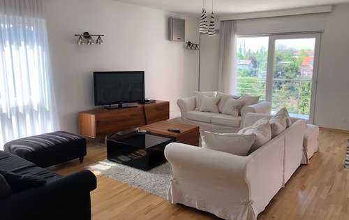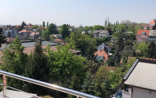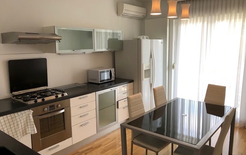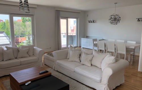 This modern property is placed on the 1st floor in 3-storey building and has approx. 120 sq m of living space. It consits of master bedroom with wardrobe, kitchen, large living room with dining area, bathroom, guest toilet and two terraces. Apartment is equipped with quality kitchen appliances, it has air-conditioner, Wi-Fi, central gas heating, storage, garage and parking space. The property is located in a very nice area of Zagreb, Salata.