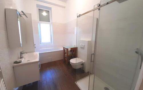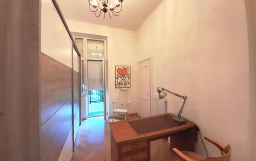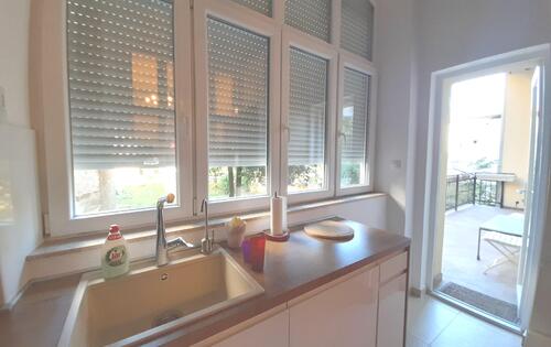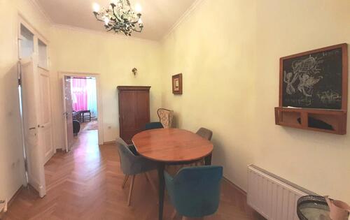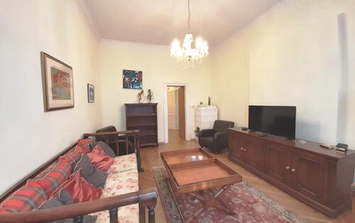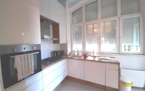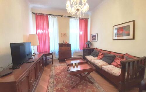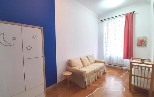 This apartment of approx. 115 sq m is placed on the high ground floor, it consists of a living room, a master bedroom, single bedroom, bathroom, toilette, study room, dining room, and nice bright kitchen overlooking the back yard with access to a spacious terrace. Kitchen is fully equipped with all necessary appliances. The apartment is modern and stylishly decorated, with original pieces of furniture from particular styles. Central gas heating, air conditioning. The apartment is located in Zone 1, close to the Main square and British (Britanski) square.