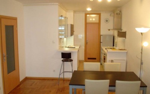 This property is placed on 1st floor in 8-storey building in Sigecica. It is new build area, close to business zone in Vukovarska and Radnicka Street. The property holds entry hall, one double bedroom, open plan fully equipped kitchen and balcony. It has central gas heating, washing machine, dish-washer and TV.