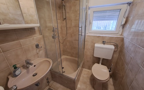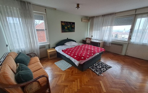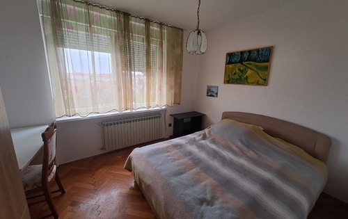 This 3-bedroom apartment is suitable for students, each room is 450 eur with utilities included. First level consists of a kitchen, spacious living room with dining and large terrace overlooking downtown, separate toilet. Upper level consists of one bedroom with balcony, 1 double bedroom and 1 single bedroom, 2 bathrooms with shower. Available garage for 1 car. The apartment is very spacious, bright, located on Salata, 5 minutes from Park Ribnjak and 5 minutes walking distance from Faculty of Medicine.