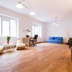 This property is placed on the ground floor and consists of a hallway, bathroom, storage room. From the dining area, you enter to two rooms, on the left there is a smaller room, and on the right side one of 20 sq m, with an exit to a terrace and garden. The apartment doesn't have air conditioning and is facing the park. Public parking is free of charge. The apartment can be rented out as office space and it is unfurnished.